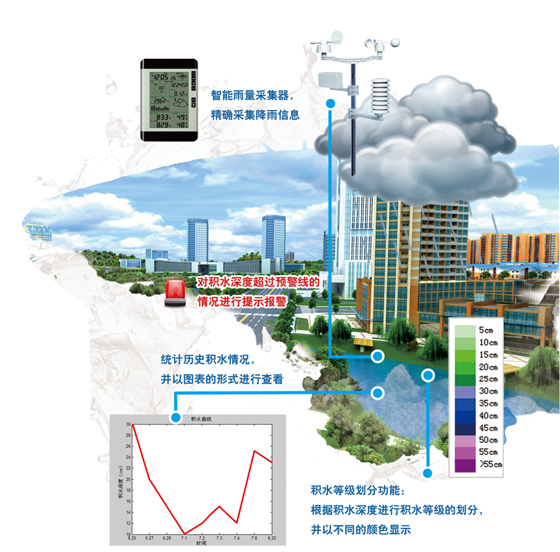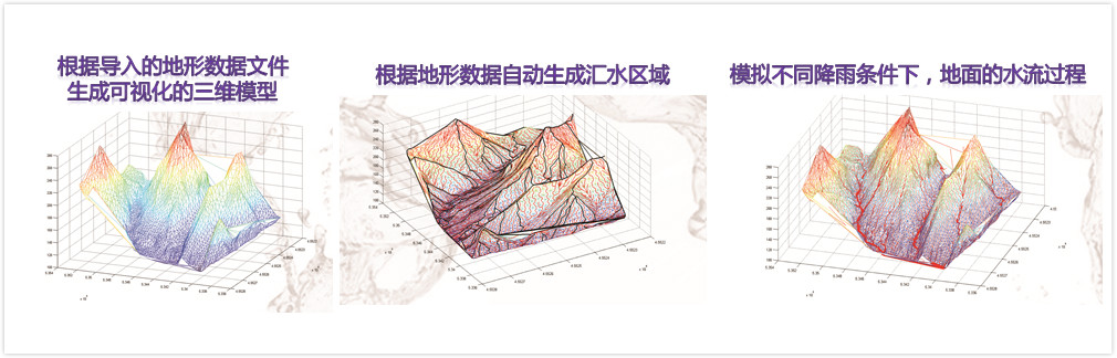 本系統應用三維地理信息技術,建立匯水區域自動生產模型,充分考慮地面滲透、土地利用、地面粗糙程度等因素對地面水流流動的影響,在數字化排水管網以及排水設施資料的基礎上,應用水動力學原理以及雨量排出平衡原理,結合氣象預報數據,模擬不同降雨條件下城市地面以及排水管道徳水量和水位變化,達到給水預測的目的,對積水深度超過預警線的情況提供報警。