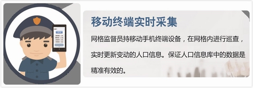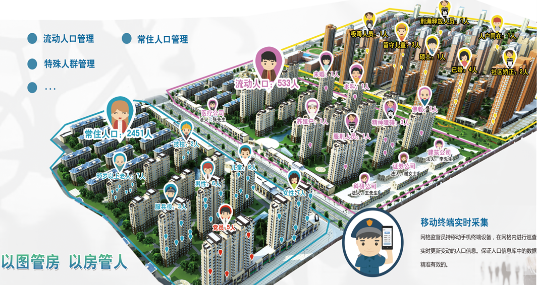 人口信息管理系統通過在社區、街道安排網絡監管員,以公安人口信息為核心,以公民身份證號碼為唯一代碼,進入人口基礎信息的實時采集和更新,內容包括住址、政治面貌、家庭成員、不良行為、工作變更記錄、教育經歷、人員流動記錄、社會貢獻等39大類200多個小項信息。同時,將城市中的房產和人口信息相關聯,通過不動的房產對流動的人口在地里信息系統上進行定位及管理,實現“以房管人”,實現對城市中的常住人口、流動人口、以及特殊人員的管理,可以服務于社會治安管理部門、衛生與計劃生育部門、教育部門、住建部門、房產部門、黨組織等多個部門。